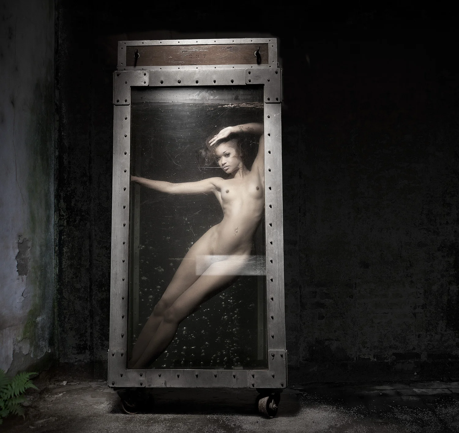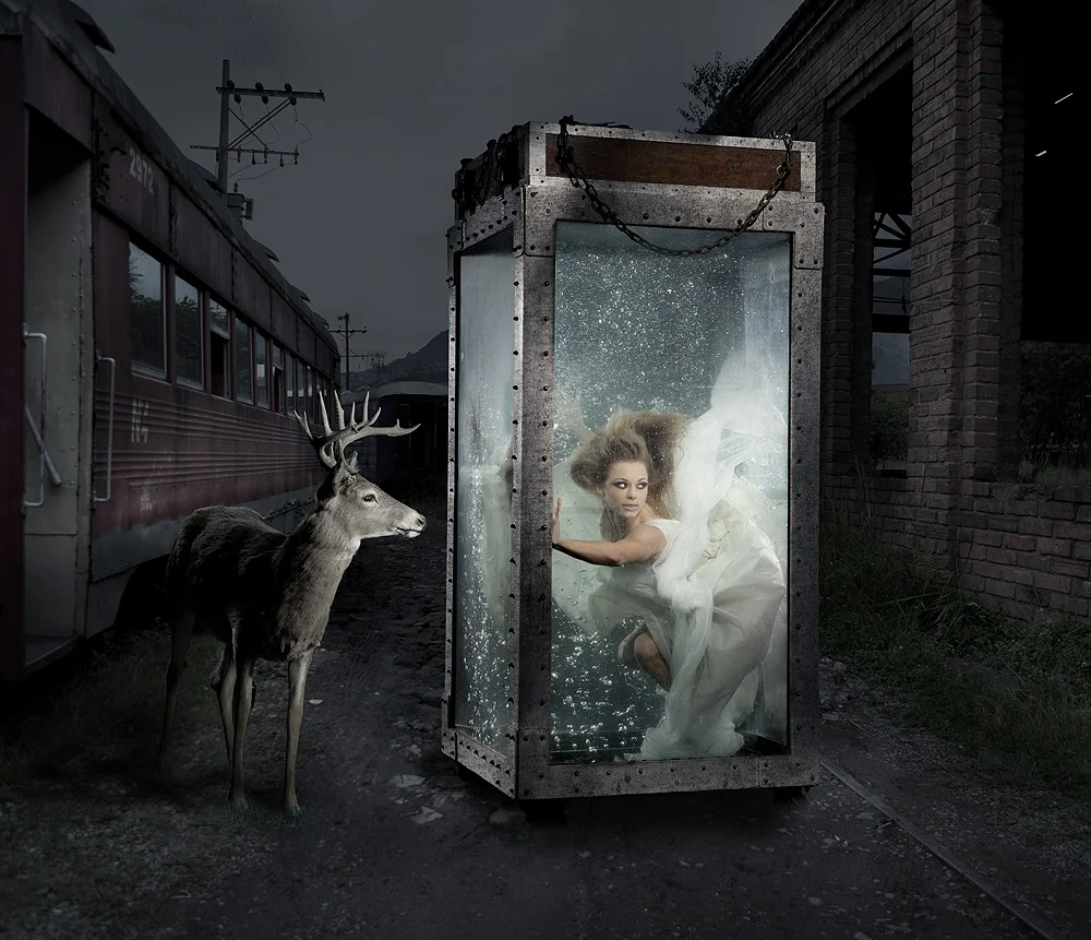 My initial concept was to have a model in an etherial dress looking through the glass at a deer in the forest, I liked the surreal implications. The day of the shoot, Teri(make-up artist) introduced me to Nikki Leigh. I knew immediately we were in good shape. Nikki is stunning and didn’t bat an eye when she saw the tank, at one point we tested her nerve as she was tightly cinched into a straight jacket within the tank.