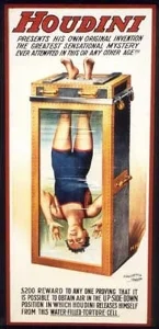 When Harry Houdini (who was was barely 5′ 6″) performed the “Chinese Water Torture Cell” escape he was lowered in headfirst with his feet locked in stocks in the tank’s lid. His feet extended out of the top so a deep tank was unnecessary. The tank is more shallow than one would expect and that would dictate whom I could comfortably photograph within it.